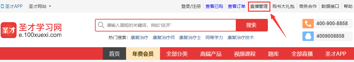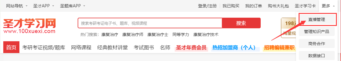 (1)访问圣才学习网(www.100xuexi.com)、云直播(zhibo.100xuexi.com)或者旗下其他业务网站,点击顶部的“直播管理”,登录后进入直播管理界面。